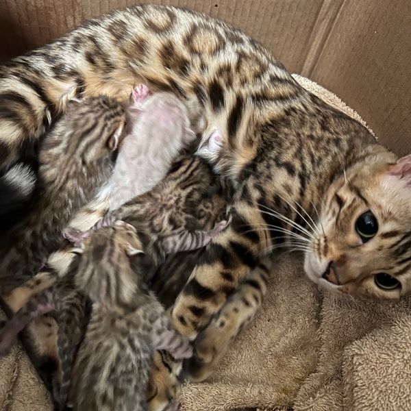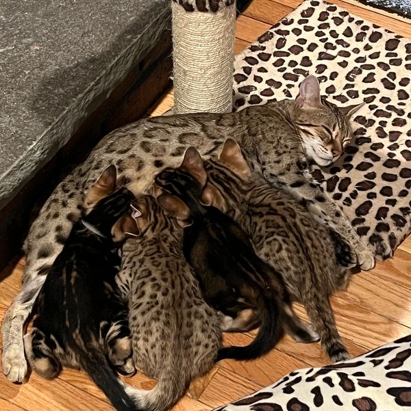 Our Bengal kittens are ready to join their new family between the ages of 10 and 12 weeks. Once they reach this age, they have had the opportunity to build a good immune system, they have been completely socialized and are litter box trained.
